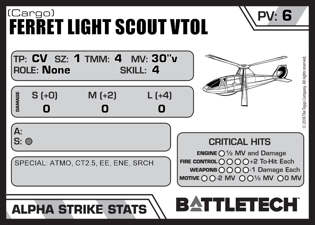 | Ferret Light Scout VTOL (Armor) "Wild Weasel" | 103 | 11 | Introductory | TR:3039 | |