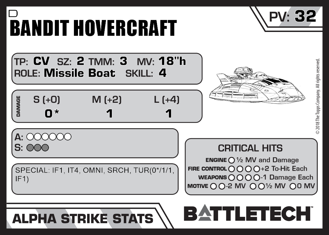 | Bandit Hovercraft "Warthog" | 872 | 32 | Experimental | XTR:Gladiators | |