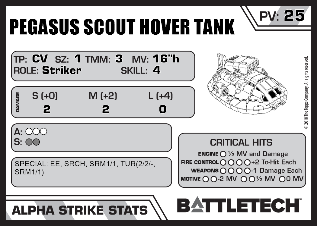 | Pegasus Scout Hover Tank (3058 Upgrade) | 706 | 30 | Standard | TR:3058U | |