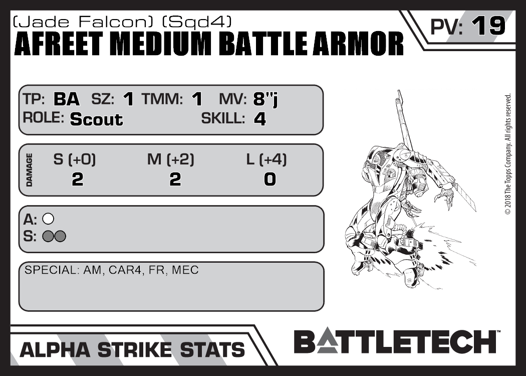 | Afreet Medium Battle Armor (Jade Falcon) (Sqd5) | 439 | 19 | Standard | TR:3075 | |