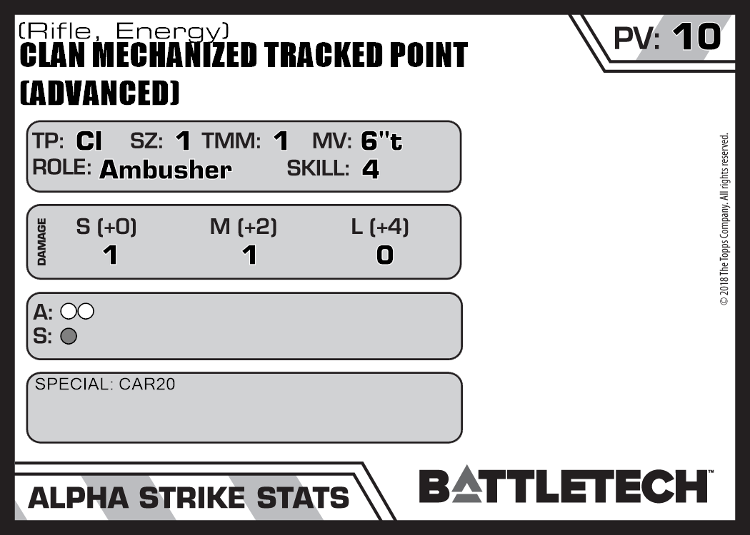 | Clan Mechanized Tracked Point (Advanced) (Rifle, Ballistic) | 102 | 6 | Advanced | TO:AUE | |