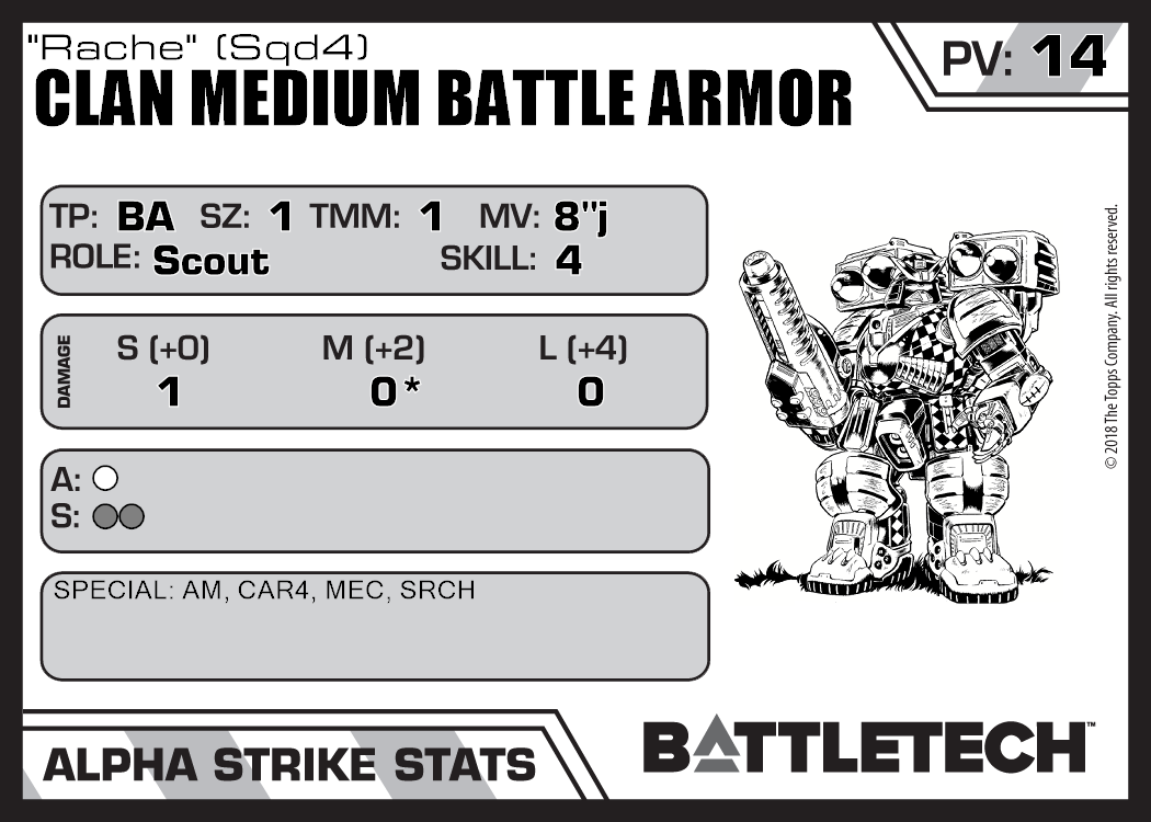 | Clan Medium Battle Armor "Rache" (Sqd5) | 372 | 18 | Standard | TR:3085 | |