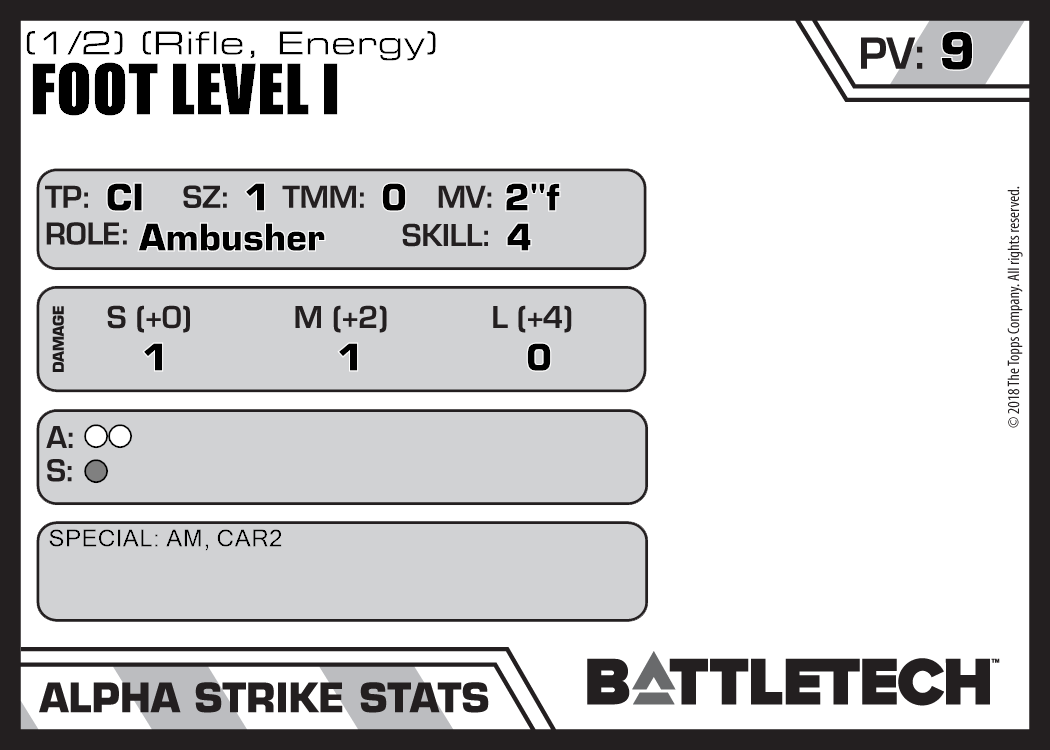 Two unit cards are needed to represent a single Level I (36 soldiers) of ComStar or Word of Blake foot infantry. The listed PV/BV is for a single card.