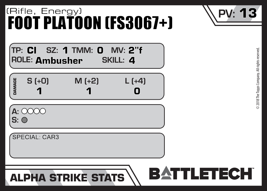 | Foot Platoon (FS3067+) (Rifle, Ballistic) | NA | 11 | Advanced | TO:AUE | |