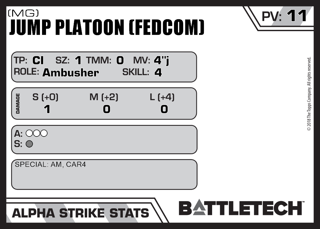 | Jump Platoon (FedCom) (Rifle, Ballistic) | NA | 12 | Advanced | TO:AUE | |