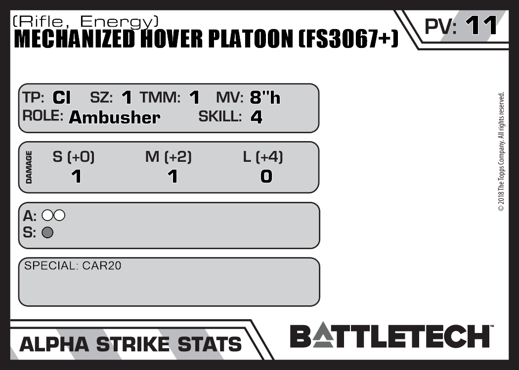 | Mechanized Hover Platoon (FS3067+) (Rifle, Ballistic) | NA | 7 | Advanced | TO:AUE | |
