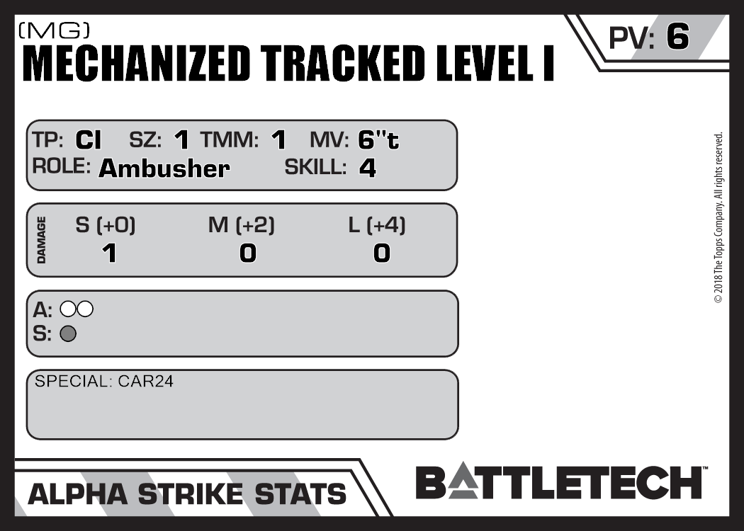 | Mechanized Tracked Level I (Rifle, Energy) | NA | 10 | Standard | TW | |