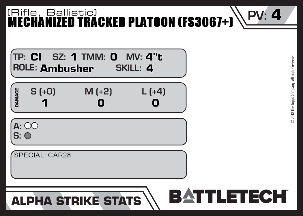 | Mechanized Tracked Platoon (FS3067+) (Rifle, Energy) | NA | 7 | Advanced | TO:AUE | |