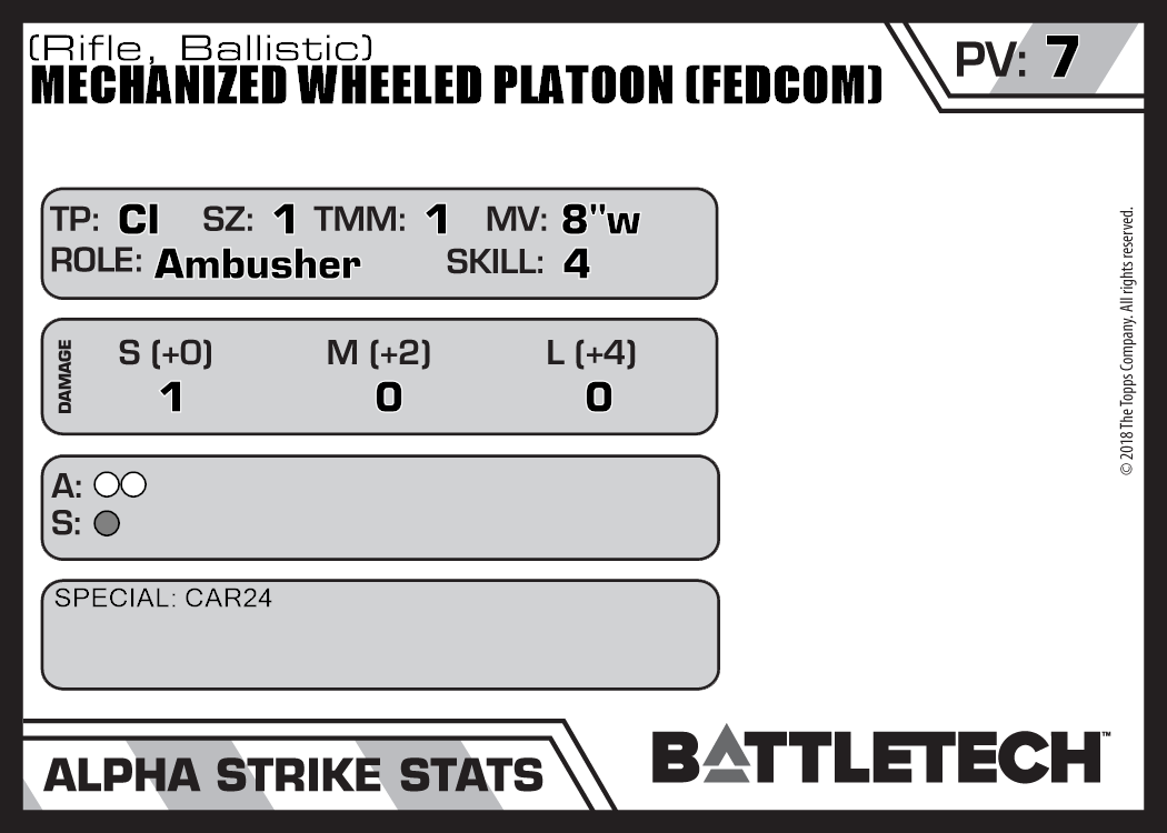 | Mechanized Wheeled Platoon (FedCom) (Rifle, Energy) | NA | 11 | Advanced | TO:AUE | |