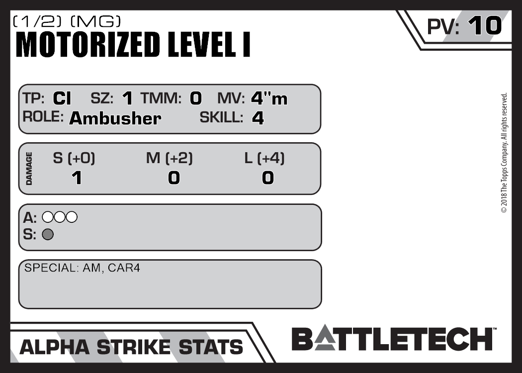 | Motorized Level I (1/2) (Rifle, Energy) | NA | 13 | Standard | TW | |