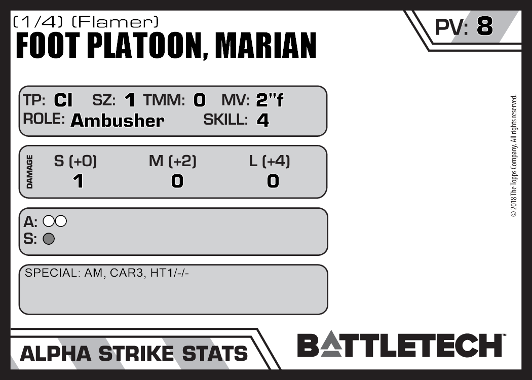 Four unit cards are needed to represent a single Platoon (100 soldiers) of Marian Foot Infantry. The listed PV/BV is for a single card.