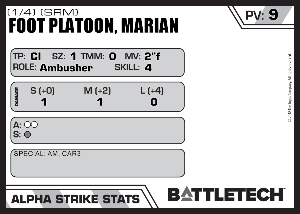 Four unit cards are needed to represent a single Platoon (100 soldiers) of Marian Foot Infantry. The listed PV/BV is for a single card.