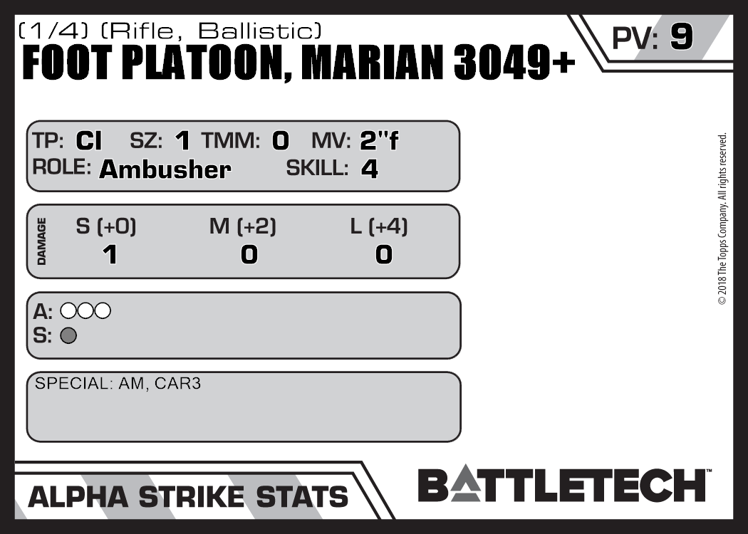 | Foot Platoon, Marian 3049+ (1/4) (LRM) | NA | 11 | Advanced | TO:AUE | |
