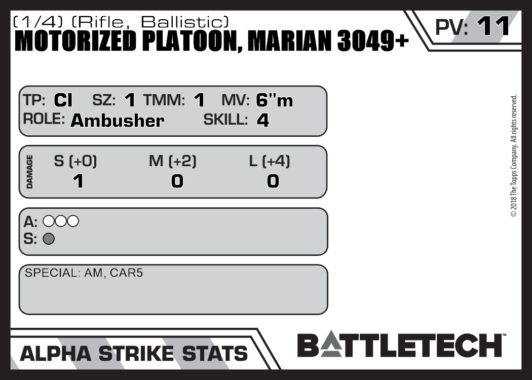 | Motorized Platoon, Marian 3049+ (1/4) (Rifle, Energy) | NA | 11 | Advanced | TO:AUE | |