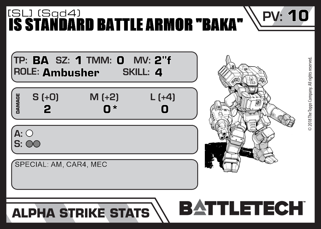 | IS Standard Battle Armor "Baka" [SL] (Sqd6) | 315 | 12 | Standard | TR:3150 |