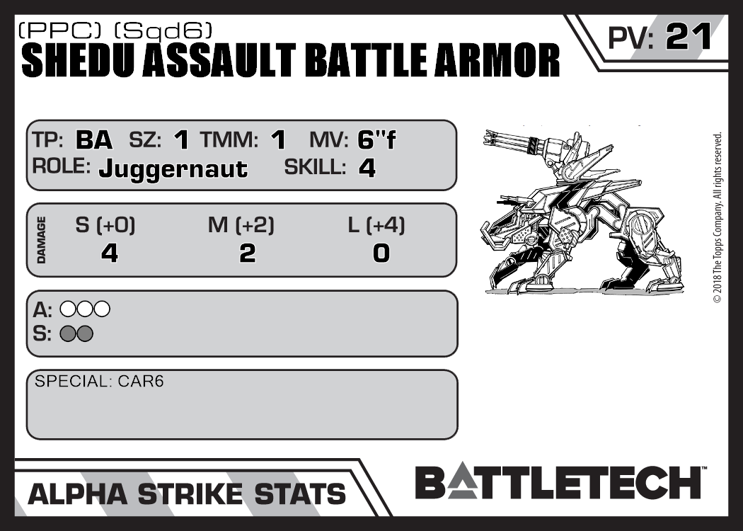 | Shedu Assault Battle Armor (PPC) (Sqd5) | 485 | 20 | Advanced | TR:3075 | |