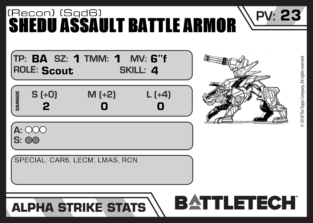 | Shedu Assault Battle Armor (Sqd6) | 651 | 22 | Standard | TR:3075 | |