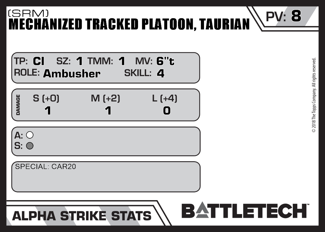 | Mechanized Tracked Platoon, Taurian (LRM) | NA | 8 | Standard | TW |