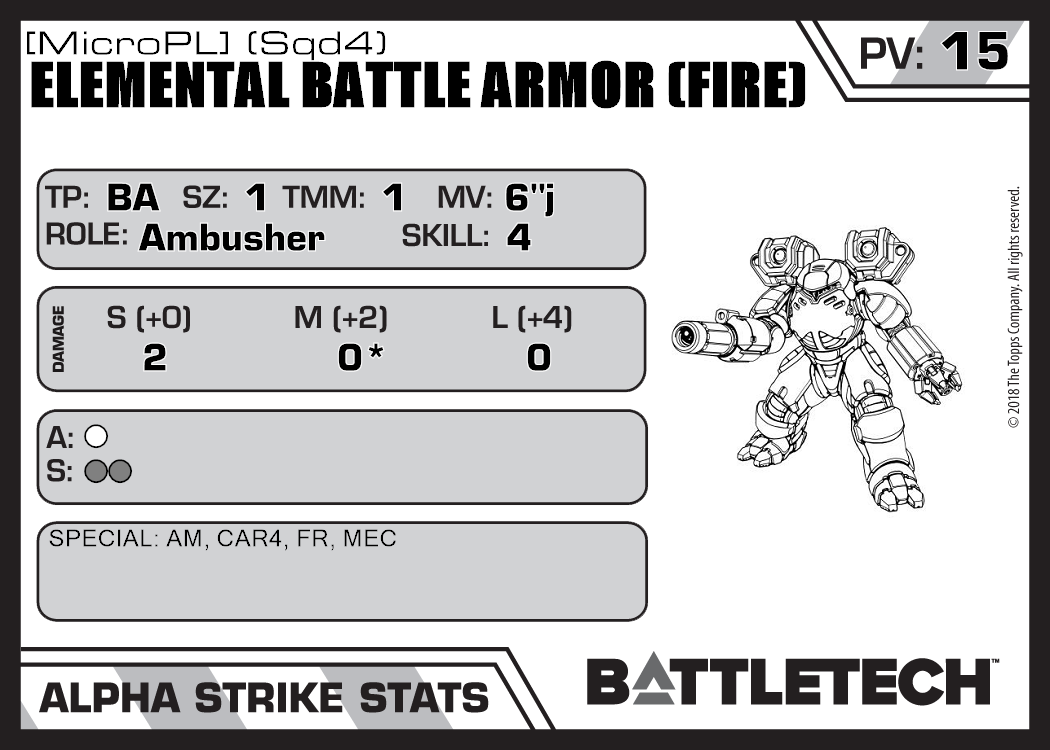 | Elemental Battle Armor (Fire) [MicroPL] (Sqd6) | 615 | 19 | Standard | TR:3085 |