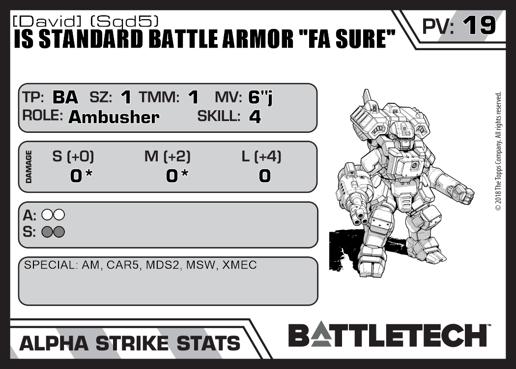 | IS Standard Battle Armor "Fa Sure" [David] (Sqd6) | 379 | 20 | Standard | TR:3150 | |