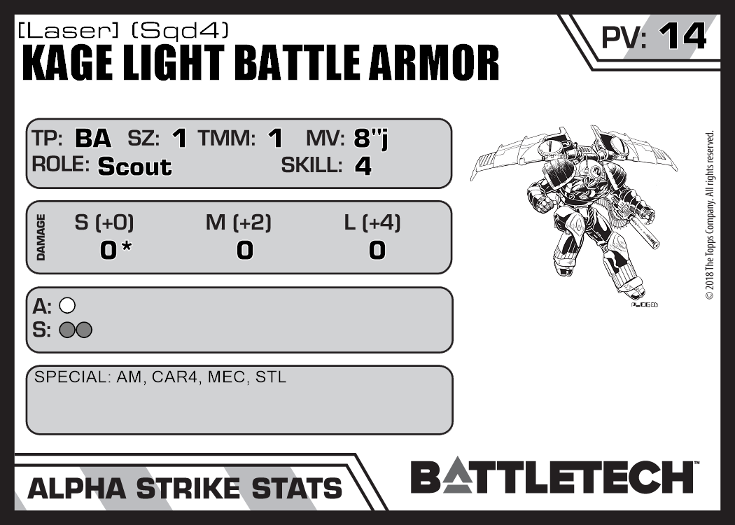 | Kage Light Battle Armor [Laser] (Sqd6) | 194 | 15 | Standard | TR:3058U | |