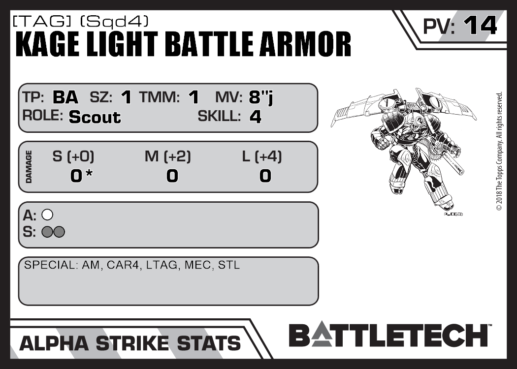 | Kage Light Battle Armor [Laser] (Sqd6) | 194 | 15 | Standard | TR:3058U | |