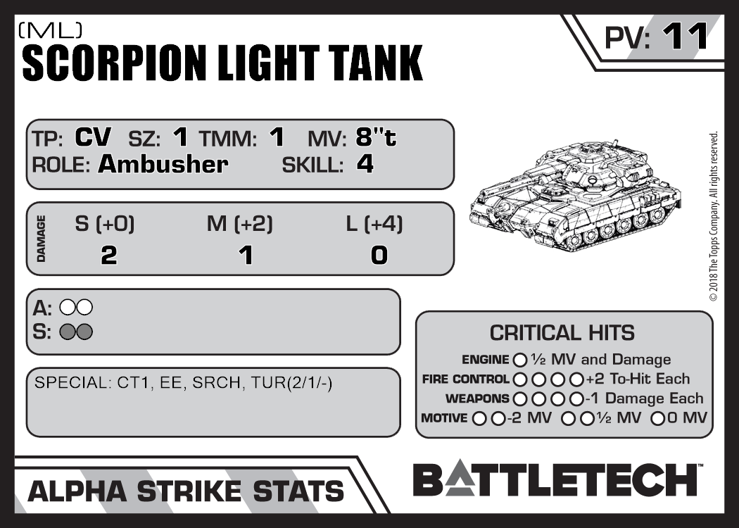 | Scorpion Light Tank (Armor) | 325 | 11 | Standard | RG33 | |