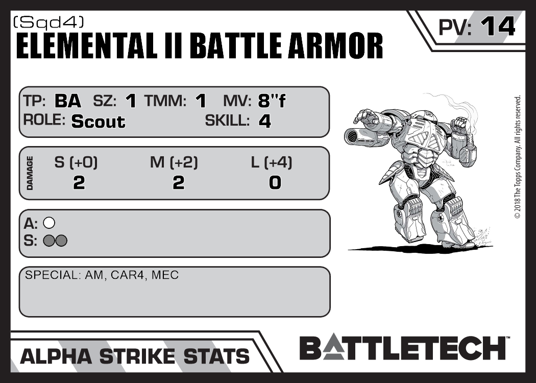 | Elemental II Battle Armor X (Sqd4) | 230 | 15 | Experimental | XTR:Clans | |