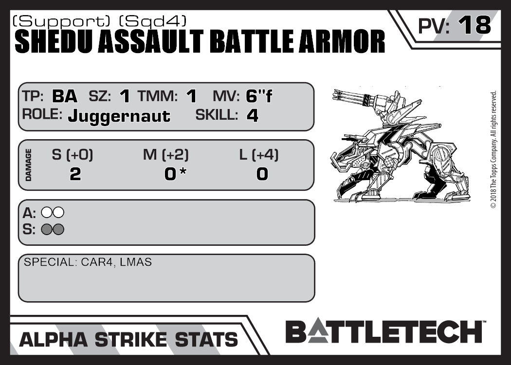 | Shedu Assault Battle Armor (Sqd4) | 376 | 18 | Standard | TR:3075 | |