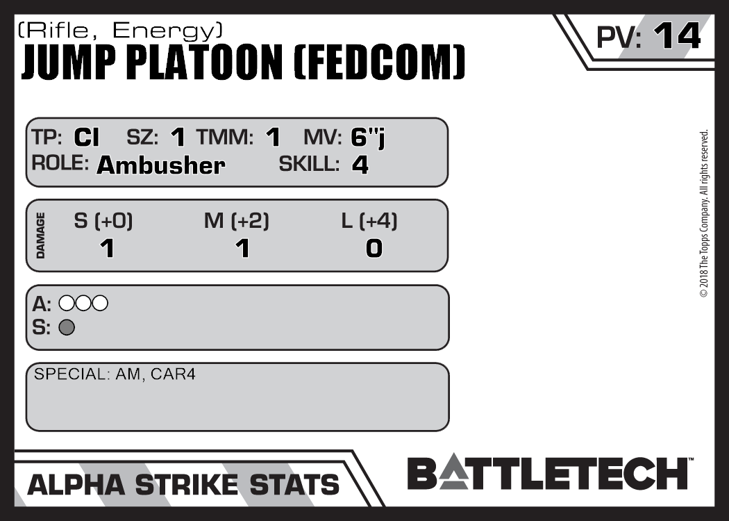 | Jump Platoon (FedCom) (Rifle, Ballistic) | NA | 12 | Advanced | TO:AUE | |