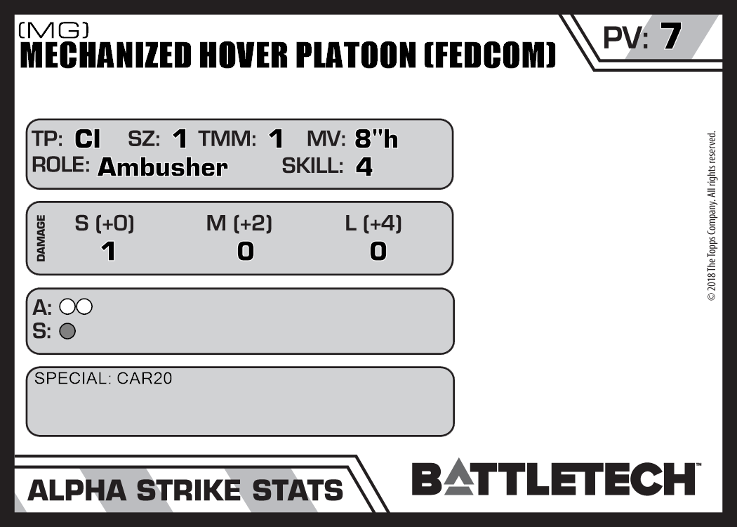 | Mechanized Hover Platoon (FedCom) (Rifle, Ballistic) | NA | 7 | Advanced | TO:AUE | |