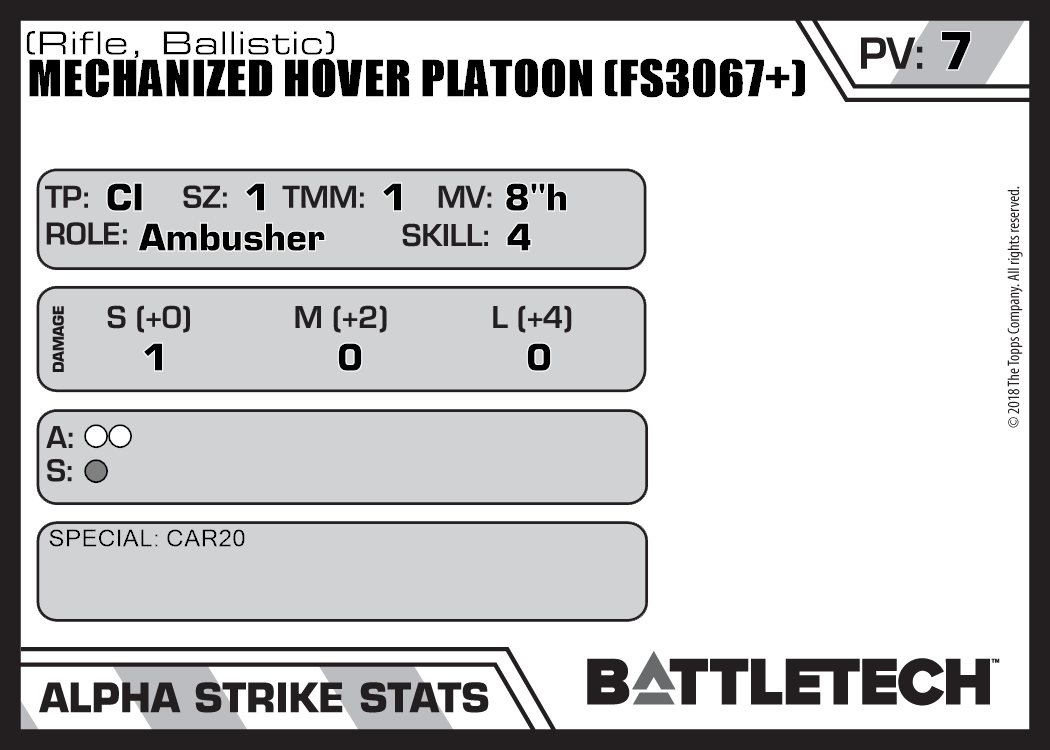 | Mechanized Hover Platoon (FS3067+) (Rifle, Energy) | NA | 11 | Advanced | TO:AUE | |