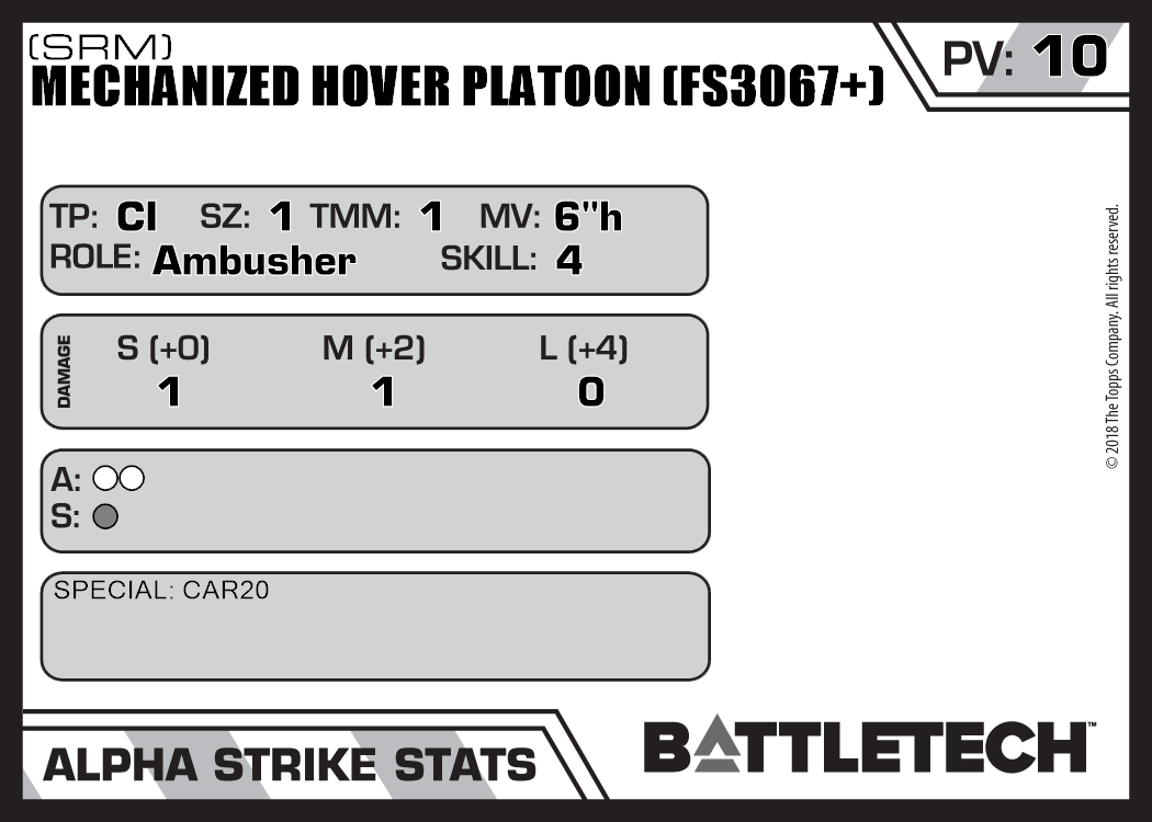 | Mechanized Hover Platoon (FS3067+) (Rifle, Energy) | NA | 11 | Advanced | TO:AUE | |