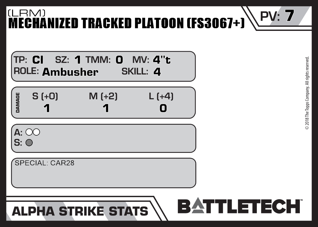 | Mechanized Tracked Platoon (FS3067+) (Rifle, Energy) | NA | 7 | Advanced | TO:AUE | |