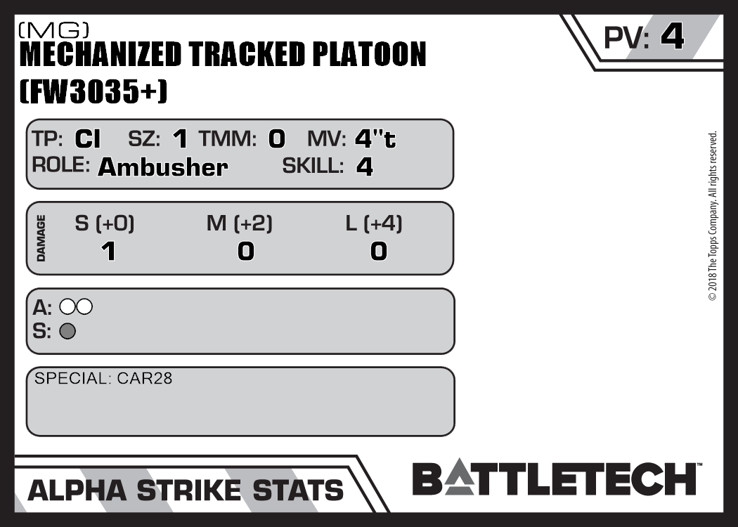 | Mechanized Tracked Platoon (FW3035+) (Rifle, Energy) | NA | 7 | Advanced | TO:AUE | |
