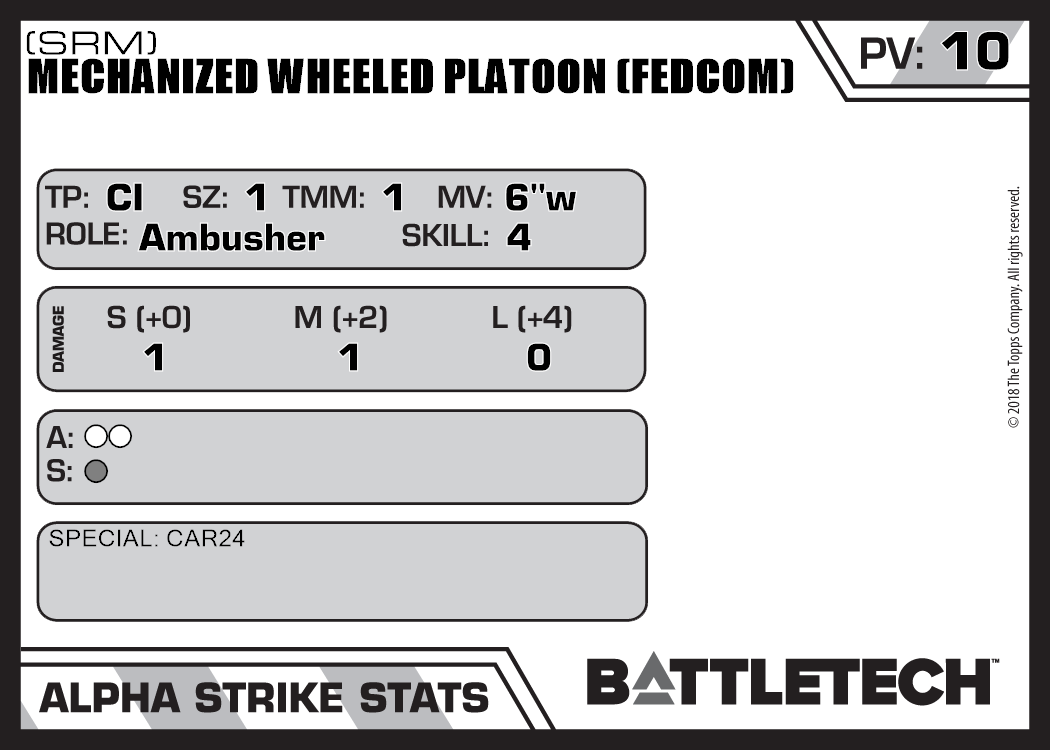 | Mechanized Wheeled Platoon (FedCom) (Rifle, Ballistic) | NA | 7 | Advanced | TO:AUE |