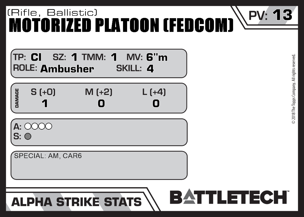 | Motorized Platoon (FedCom) (MG) | NA | 12 | Advanced | TO:AUE | |