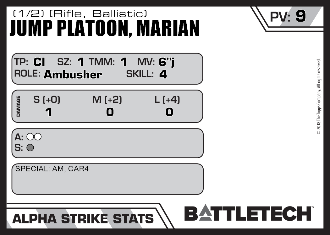 Two unit cards are needed to represent a single Platoon (50 soldiers) of Marian Jump Infantry. The listed PV/BV is for a single card.