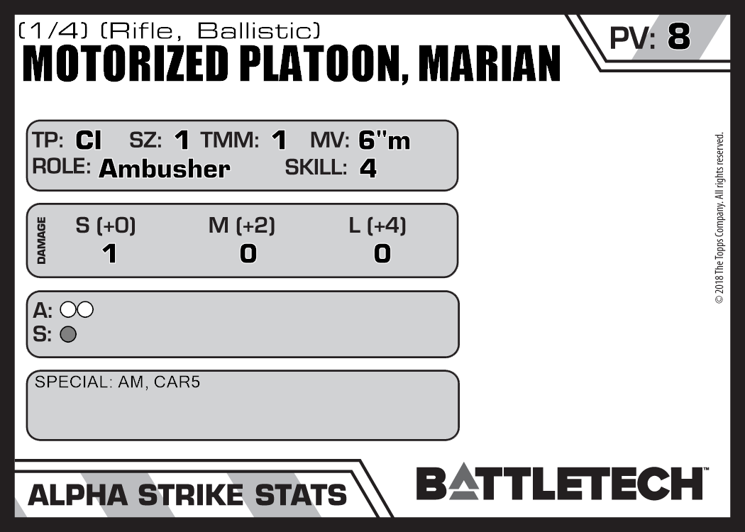 | Motorized Platoon, Marian (1/4) (Rifle, Energy) | NA | 9 | Standard | TW | |