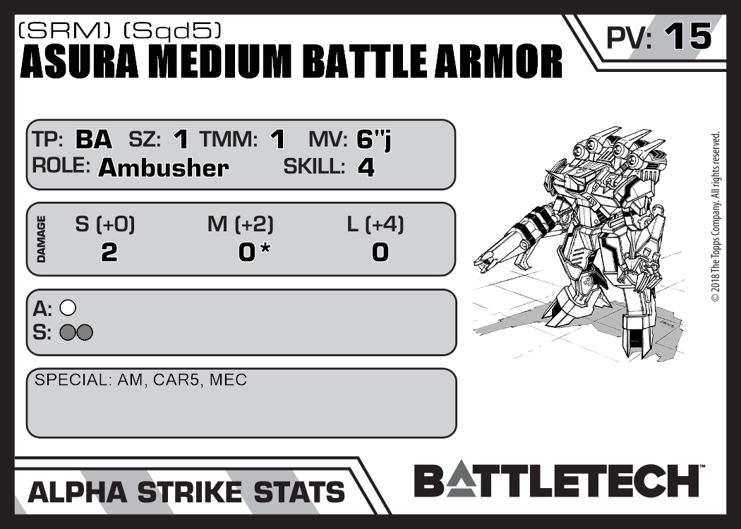 | Asura Medium Battle Armor (SRM) (Sqd6) | 383 | 15 | Standard | TR:3075 | |