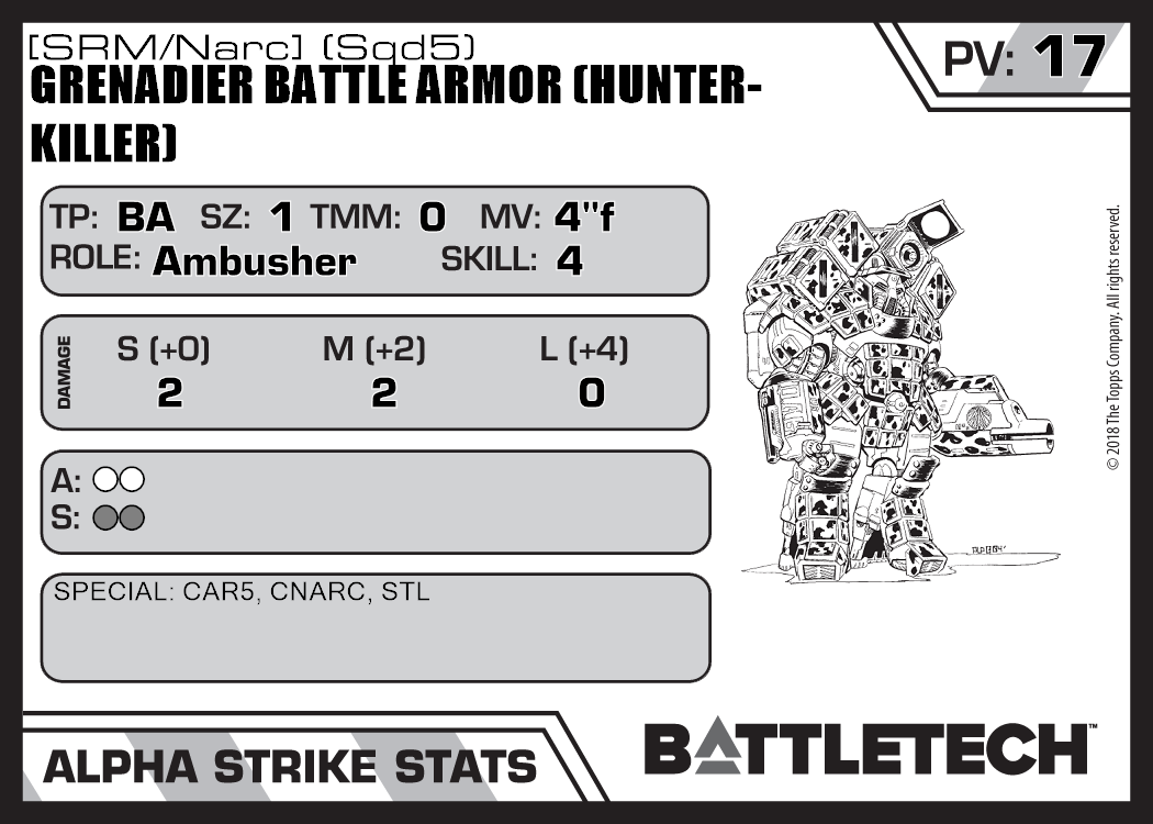 | Grenadier Battle Armor (Hunter-Killer) [SRM/Narc] (Sqd6) | 662 | 20 | Standard | TR:3075 | |