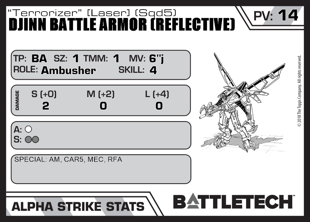 | Djinn Battle Armor (Reflective) “Terrorizer” [Laser] (Sqd6) | 382 | 14 | Experimental | XTR:Most Wanted |
