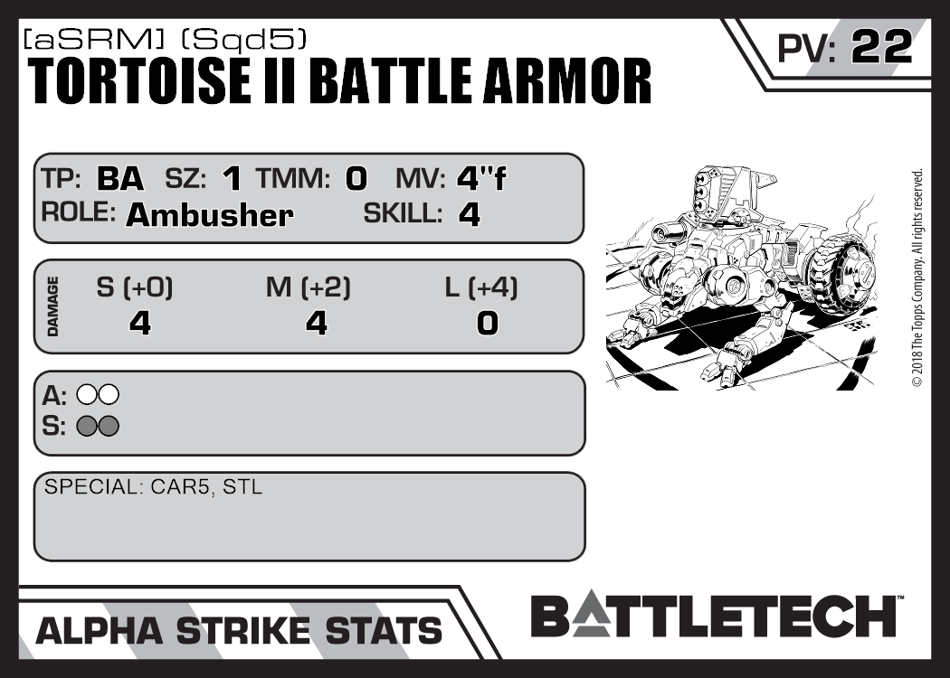 | Tortoise II Battle Armor [C3] (Sqd4) | 619 | 22 | Advanced | XTR:RotS 2 | |