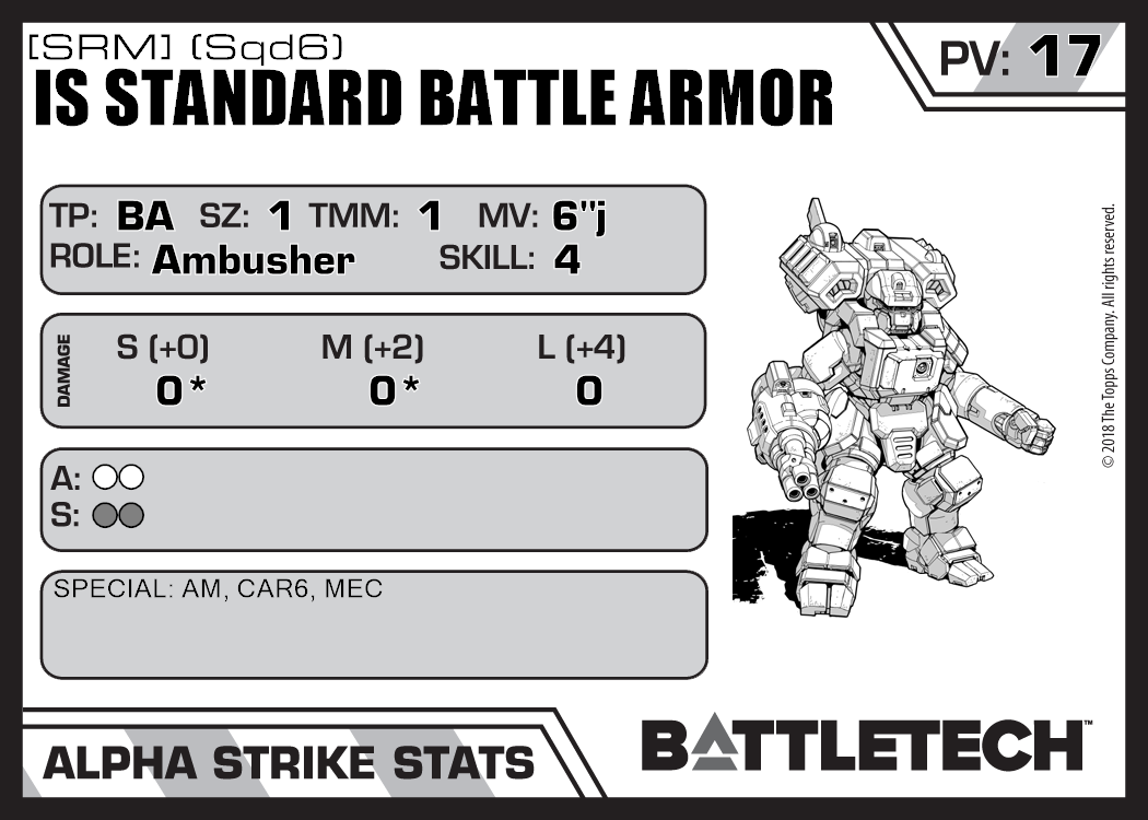 | IS Standard Battle Armor [Laser] (Sqd6) | 400 | 17 | Standard | TR:3058U | |