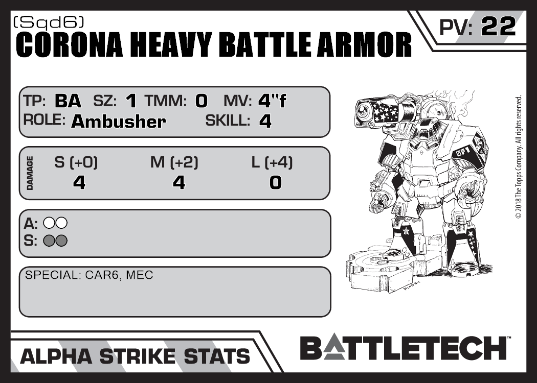 | Corona Heavy Battle Armor (SRM) (Sqd6) | 646 | 24 | Standard | TR:3075 |