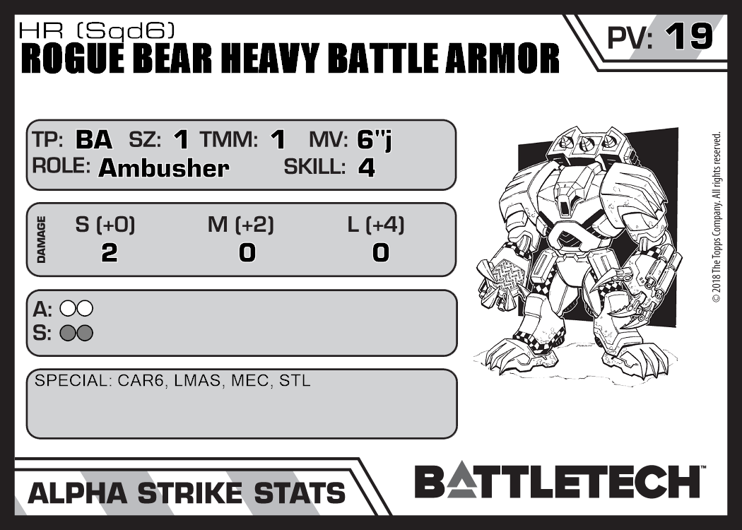 | Rogue Bear Heavy Battle Armor (Sqd6) | 599 | 21 | Standard | TR:3075 | |