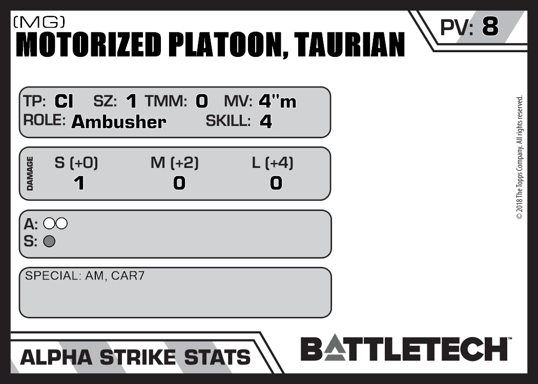 | Motorized Platoon, Taurian (LRM) | 97 | 10 | Standard | TW | |