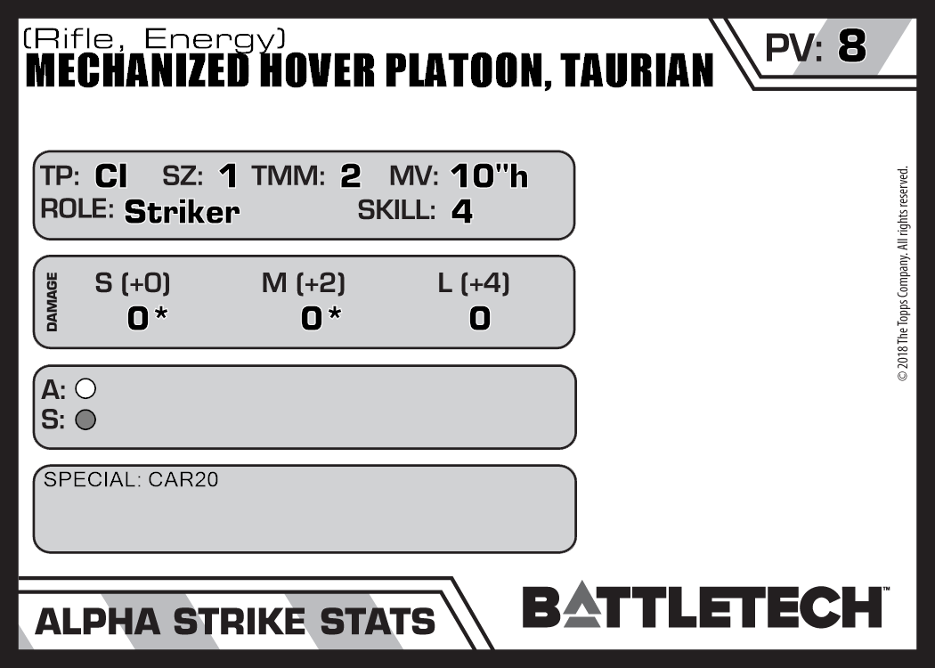 | Mechanized Hover Platoon, Taurian (Rifle, Ballistic) | NA | 5 | Standard | TW | |