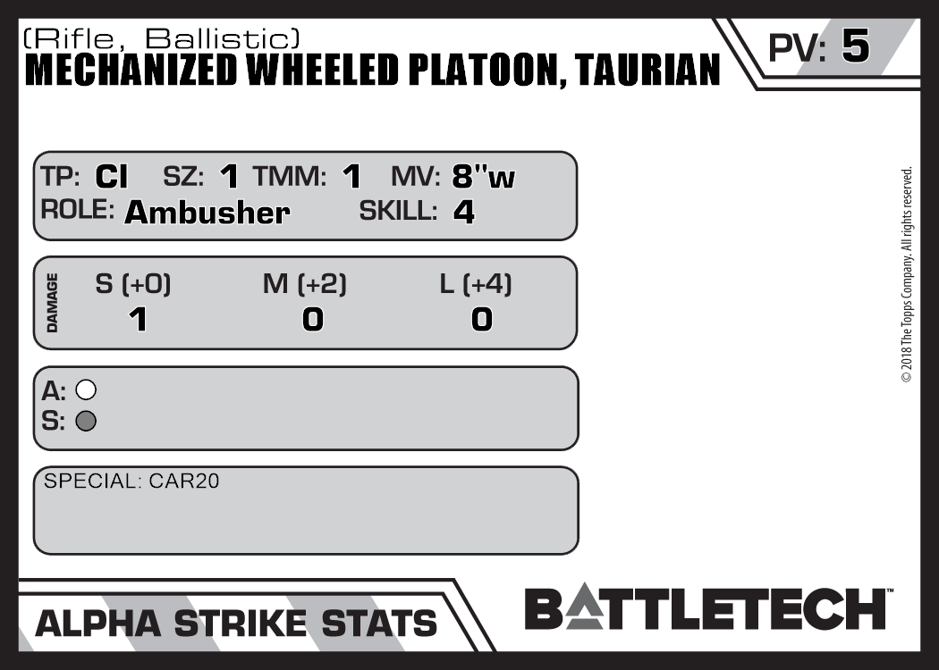 | Mechanized Wheeled Platoon, Taurian (MG) | NA | 5 | Standard | TW | |