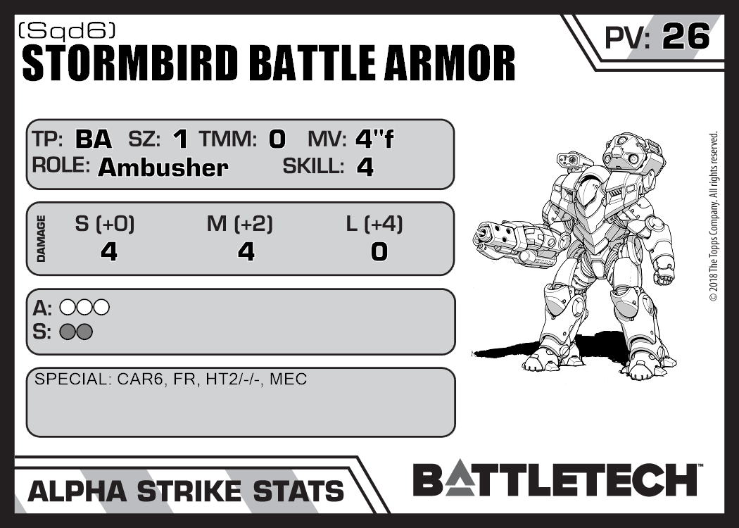 | Stormbird Battle Armor (Jade Falcon) (Sqd6) | 754 | 23 | Standard | RG30 |